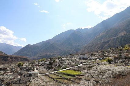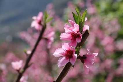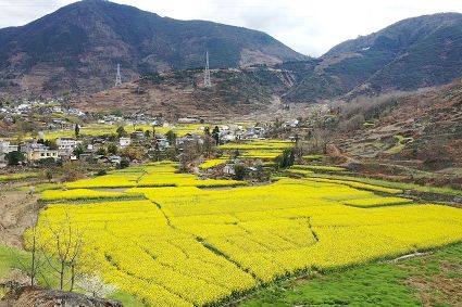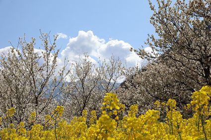 在瀘定縣冷磧鎮(zhèn)、德威鎮(zhèn)等地,桃花、油菜花及櫻花競相開放,一團(tuán)團(tuán)、一簇簇,綴滿枝頭,藍(lán)天、白云與各色花兒相交,金黃花海在微風(fēng)中起伏。一畦畦油菜花田錯(cuò)落有致、層次分明,綿延不斷?!岸聶鸦ㄩ_,三月桃花盛,四月紅櫻桃,五月水蜜桃。”除了油菜花,每年陽春三月,瀘定的桃花也隨著和煦春風(fēng)落滿枝頭滿樹的花芽沁著香氣,一點(diǎn)點(diǎn)溢到空氣中,香了春風(fēng),也香了整座城。