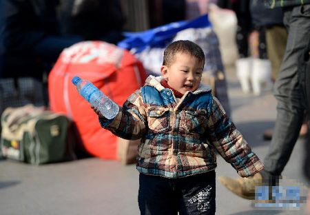 1月19日,一個(gè)小男孩在南京火車站幫家長推運(yùn)行李。