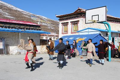 中午,高原的陽光暖洋洋的,有了空閑時(shí)間的村民們都來到活動(dòng)中心,一邊曬太陽,一邊觀看孩子們的表演。