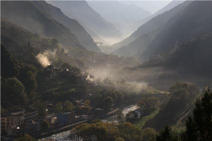 落日將最后一道霞光在山尖劃過,暗夜便裹挾這寒意搖動起山林中的樹木。風(fēng)漸緊,那已經(jīng)稀稀落落的樹葉隨著風(fēng)的韻律,跳起歡快的鍋莊,仿佛在告別這一年的繁華。突如其來的大雪,給丹巴的二月涂上白色的記號。從山尖到院前的樹上,一溜兒雪白,正應(yīng)了“忽如一夜春風(fēng)來,千樹萬樹梨花開”的情景,讓人忍不住伸出手指看看這花是真是假。大雪過后,陽光如約而至撒滿藏寨,金色陽光和蒸騰的白霧縈繞在雪白的山頭,與山下的古碉藏寨,河畔的清流巧妙地構(gòu)成一幅絕美畫卷,讓人仿佛身處仙境。吸足了養(yǎng)分的柳樹終于抽出綠芽送來春天的信號,那柳條兒在細(xì)風(fēng)吹拂下宛如少女對鏡梳妝,在陽光下顯得無比溫柔,讓人不禁想貼近它們,感受這溫暖又靜謐的溫柔。