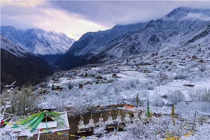 突然,耳畔傳來了誦經(jīng)聲。山坡下的平臺(tái)上,是一排白塔。白塔的周圍,掛滿了經(jīng)幡。早起的誦經(jīng)人,沿著中路藏寨的小路來到白塔,一邊轉(zhuǎn)白塔,一邊虔誠誦經(jīng)。一年四季的地區(qū)稱春雨貴如油,那么旱雨兩季的地區(qū)該怎么贊美春雪呢?怕是該稱為春雪貴如金了。祈愿吧——一年好時(shí)節(jié),又是一個(gè)豐收年!