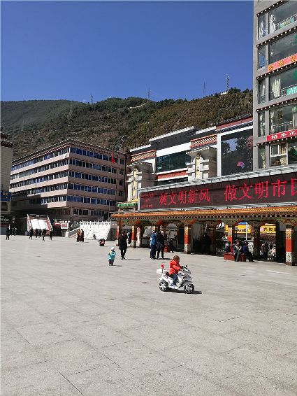 陽(yáng)光碎碎的灑下,穿透過(guò)空氣,我們一邊狠吸含有陽(yáng)光的空氣,一邊欣賞陽(yáng)光下別樣的風(fēng)景。石階兩旁,稚嫩的小草汲取了前幾天的雨水,趁著天朗氣清正努力破土;靈動(dòng)的小樹(shù)像正在站哨的士兵,認(rèn)真而仔細(xì);微風(fēng)拂過(guò),經(jīng)幡隨著風(fēng)的節(jié)奏飄揚(yáng),太陽(yáng)能路燈的風(fēng)扇慵懶的轉(zhuǎn)著,遠(yuǎn)望陽(yáng)光下的康定城,是那樣的寧?kù)o祥和。