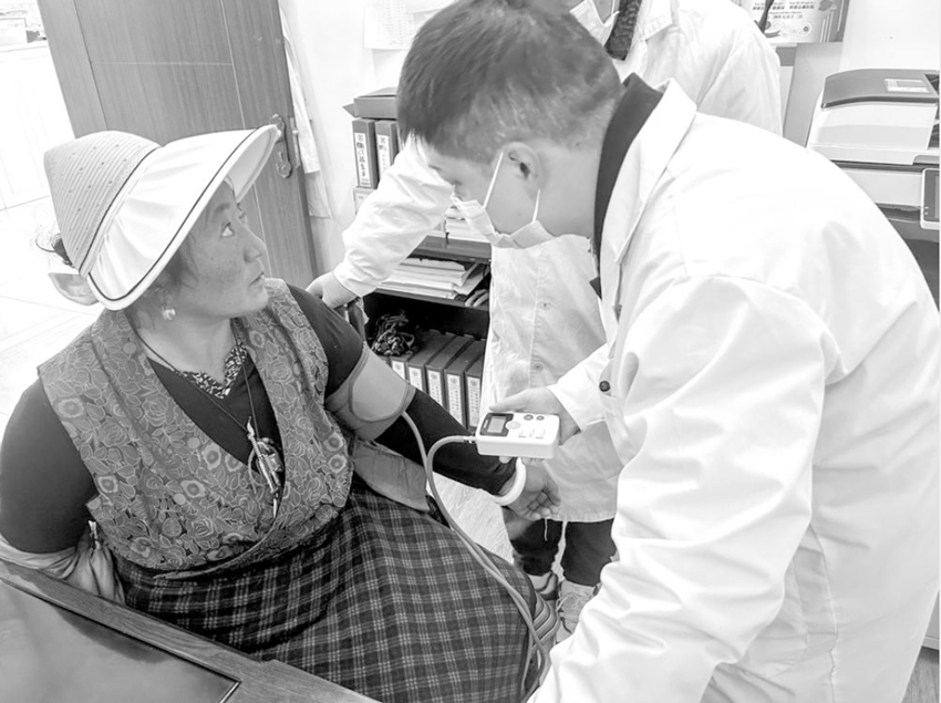 圖為醫(yī)生對患者進行動態(tài)血壓監(jiān)測。