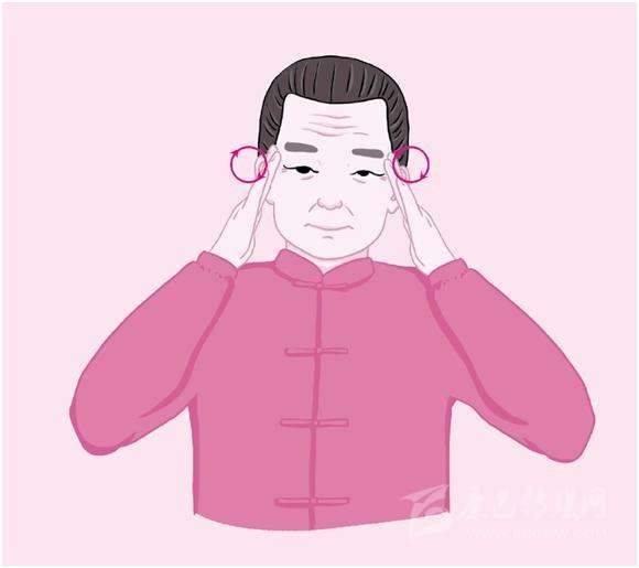 2.按揉太陽穴:順時針旋轉一周為一拍,約做32拍。