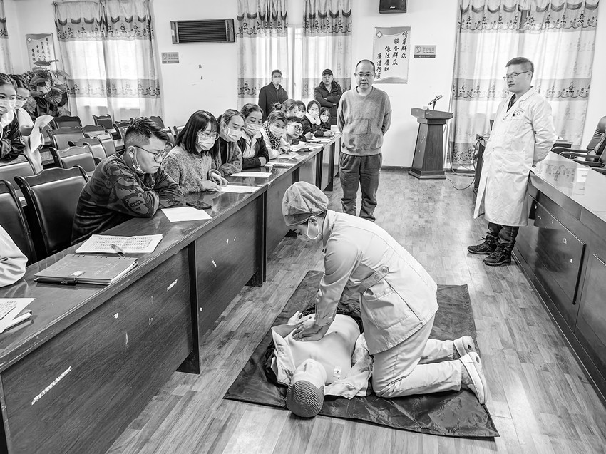 “組團式”幫扶干部對石渠縣人民醫(yī)院醫(yī)護人員進行急診急救“心肺復(fù)蘇”培訓(xùn)。
