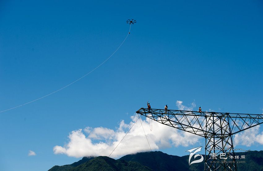 酒泉—湖南電力線路是我國目前輸電距離最長的±800千伏特高壓輸電工程,全長2383公里、投資262億元,預(yù)計(jì)于2017年2月建成投運(yùn)。酒湖線重慶巫溪段共110基輸電鐵塔,70%位于山脊,93.6%的建造需要架設(shè)專用運(yùn)輸索道。 圖為7月15日,掛載著第一級(jí)牽引導(dǎo)線的放線無人機(jī)在空中懸停配合高空作業(yè)人員完成架線作業(yè)。