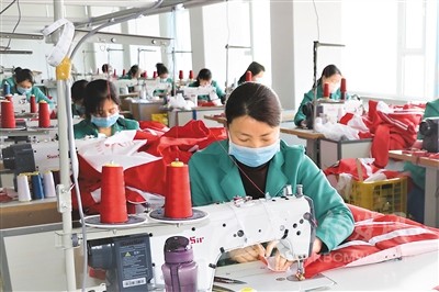 近期,甘肅省平?jīng)鍪徐o寧縣在做好疫情防控工作的同時,積極推動縣內(nèi)扶貧車間復(fù)工復(fù)產(chǎn)。截至目前,全縣57家扶貧車間已有39家恢復(fù)生產(chǎn),吸納帶動了536名貧困群眾在家門口就業(yè),增收致富。圖為靜寧縣城關(guān)鎮(zhèn)的村民在當(dāng)?shù)匾患曳鲐氒囬g縫制衣服。王 毅攝(人民視覺)