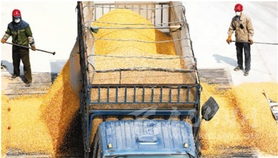 4月13日,在遼寧省鞍山市臺(tái)安縣新開河糧食儲(chǔ)備庫,兩名工作人員卸載剛剛收儲(chǔ)的玉米。