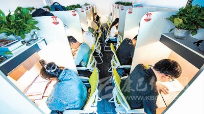 這是一家共享自習室。進入這間屋子的人,有正在準備考研、考公務員的大學生,有下班后為自己“充電”的職場人士,也有被家長送來做作業(yè)的中學生。他們每天花費50元到100元左右,就能為自己覓得一處安靜的學習天地,如果辦月卡、季卡、年卡,價格還能更優(yōu)惠。