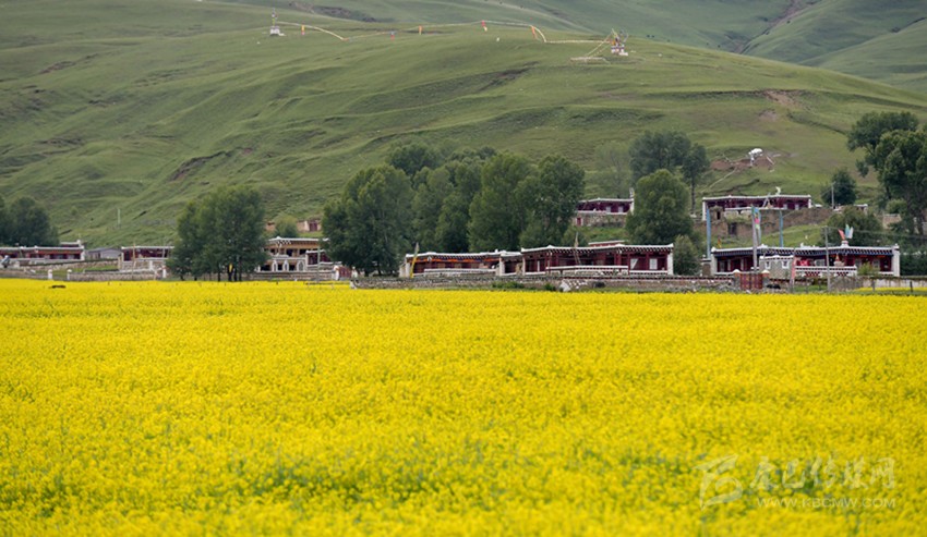 金黃的菜花與青山綠水、藏式民居相融,繪成一幅幅絕美的畫卷。據(jù)悉,道孚縣油菜盛花期將持續(xù)一個月。“油菜花開滿地黃,叢間蝶舞蜜蜂忙;清風(fēng)吹拂金波涌,飄溢醉人濃郁香”。在漫山遍野金黃色的油菜花中,掩映著華麗的藏式建筑,使得每一個逃離紛繁城市的人都能找到歸宿。(圖片由中新社記者 劉忠俊 攝)