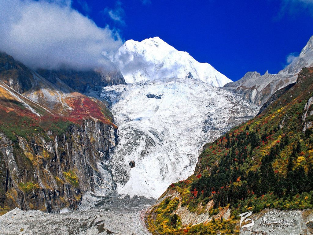 海螺溝位于四川省甘孜藏族自治州東南部,貢嘎山東坡,是青藏高原東緣的極高山地。海螺溝位于貢嘎雪峰腳下,以低海拔現(xiàn)代冰川著稱于世。晶瑩的現(xiàn)代冰川從高峻的山谷鋪瀉而下。海螺溝是亞洲最東低海拔現(xiàn)代冰川發(fā)現(xiàn)地,海拔2850米。其大冰瀑布高1080米,寬0.5米-1100米,是中國(guó)至今發(fā)現(xiàn)的最高大冰瀑布。溝內(nèi)蘊(yùn)藏有大流量沸熱溫冷礦泉,大面積原始森林和高的冰蝕山峰,大量的珍稀動(dòng)植物資源,金山、銀山交相輝映,蔚為壯觀。