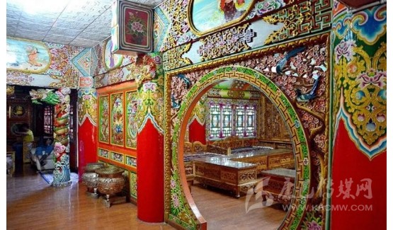道孚民居室內(nèi)精雕細(xì)鏤,描金繪彩,每一個(gè)圖案或圖畫就是一個(gè)吉祥物或一個(gè)傳說。民居客廳陳設(shè)豪華,富麗堂皇,極顯主人的富有;經(jīng)堂供奉佛像,酥油燈長(zhǎng)明,是家中的清靜之地;臥室多用箱式或椅式藏床,陳設(shè)溫馨而別具風(fēng)情。