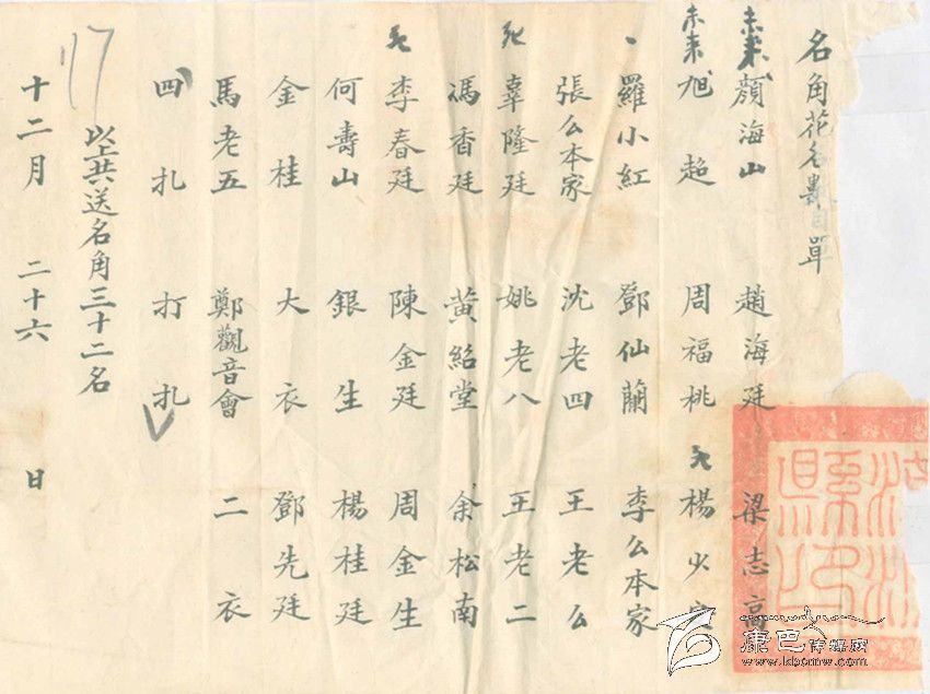 不準(zhǔn)賭博做什么呢?當(dāng)時(shí)的當(dāng)權(quán)者還是費(fèi)了一番心思,他們從外地請(qǐng)來了一個(gè)川戲班子,為了吸引人們關(guān)注,康定縣政府把戲班的名角以及配角演員名單寫成海報(bào)張貼到街頭,又抄成傳單廣為散發(fā),用現(xiàn)在的話說是,做足了戲班出場前的前期宣傳工作。從名單上看,這是一個(gè)不小的戲班子,所謂名角竟有32名之多。想來對(duì)于沒有多少文化生活的康定民眾,還是有一定的吸引力。