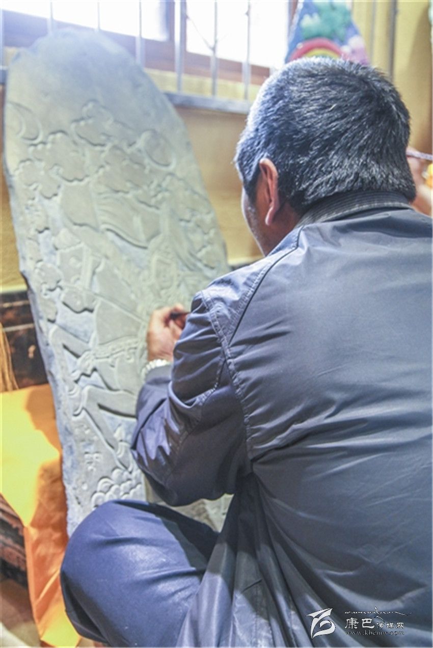 “刻一幅一米高、八十公分寬的作品,一般用時(shí)在一個(gè)月以上。”所彭接過(guò)巴德的話說(shuō),在格薩爾彩繪石刻中,最理想的尺寸就是一米高、八十公分寬。但由于各種原因,現(xiàn)在很不容易找到這么大、又適合石刻的石板。此外,也有一些人采用機(jī)器進(jìn)行刻制,但這就失去了藝術(shù)的本來(lái)價(jià)值。