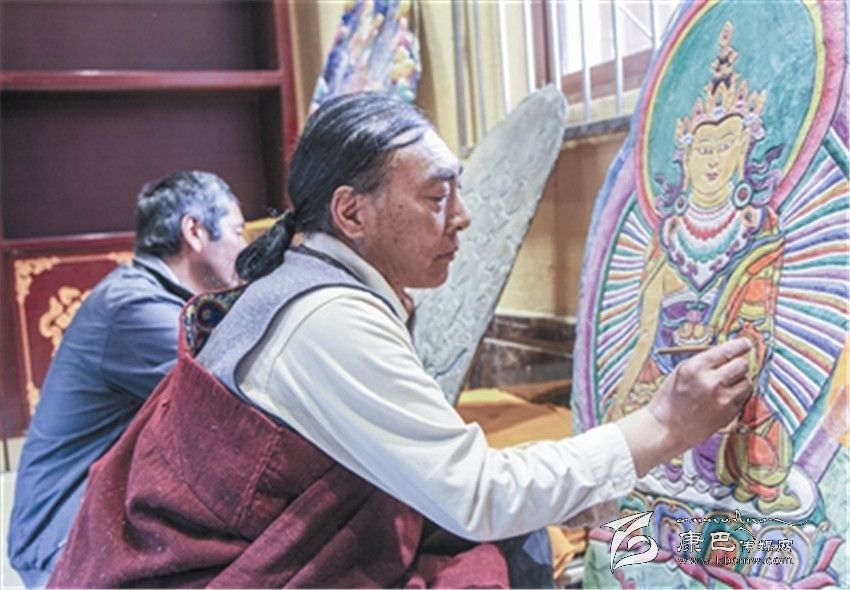 從子承父業(yè)再到吸眾家之長(zhǎng),自離開(kāi)故鄉(xiāng)的那天起,巴德的視野開(kāi)始變得開(kāi)闊起來(lái)。1979年到省藏校學(xué)習(xí)藏文和美術(shù),并開(kāi)始涉獵泥塑技藝,隨后又向德格民間藝人扎西澤郎學(xué)習(xí)彩繪石刻,然后又到西藏、甘肅等地學(xué)習(xí)繪畫(huà)、石刻技藝。巴德說(shuō),自己之所以有今天的藝術(shù)造詣,是因?yàn)橛幸慌麕熤更c(diǎn),是因?yàn)樽约旱牟粩嗵剿骱烷L(zhǎng)期堅(jiān)守。讓他欣慰的是,自己的三個(gè)兒子都在學(xué)習(xí)石刻和繪畫(huà),親戚朋友中的十多個(gè)孩子也成了他的入門(mén)弟子。