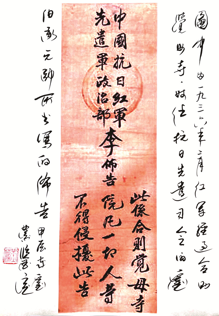 該布告和其他的布告在書寫形式上有所區(qū)別,不是現(xiàn)在常見的橫向的,是豎向的,按照上中下分三部分,發(fā)布方、責任人、發(fā)布內(nèi)容。它的落款也就是發(fā)布方的單位在上面,左右對稱,蓋章可以辨認為:中國工農(nóng)紅軍第四方面軍第三十軍政治部。中間是發(fā)布人李先念的姓李,比其他字大一倍,以示突出。在下方是布告的內(nèi)容。書寫者以行書書寫,一氣呵成,整體結構勻稱,字體大小適中,內(nèi)容簡明扼要。布告歷經(jīng)多年,保存完好,說明寺院的收藏者對布告的內(nèi)容認可,對書寫者書法充滿敬意。