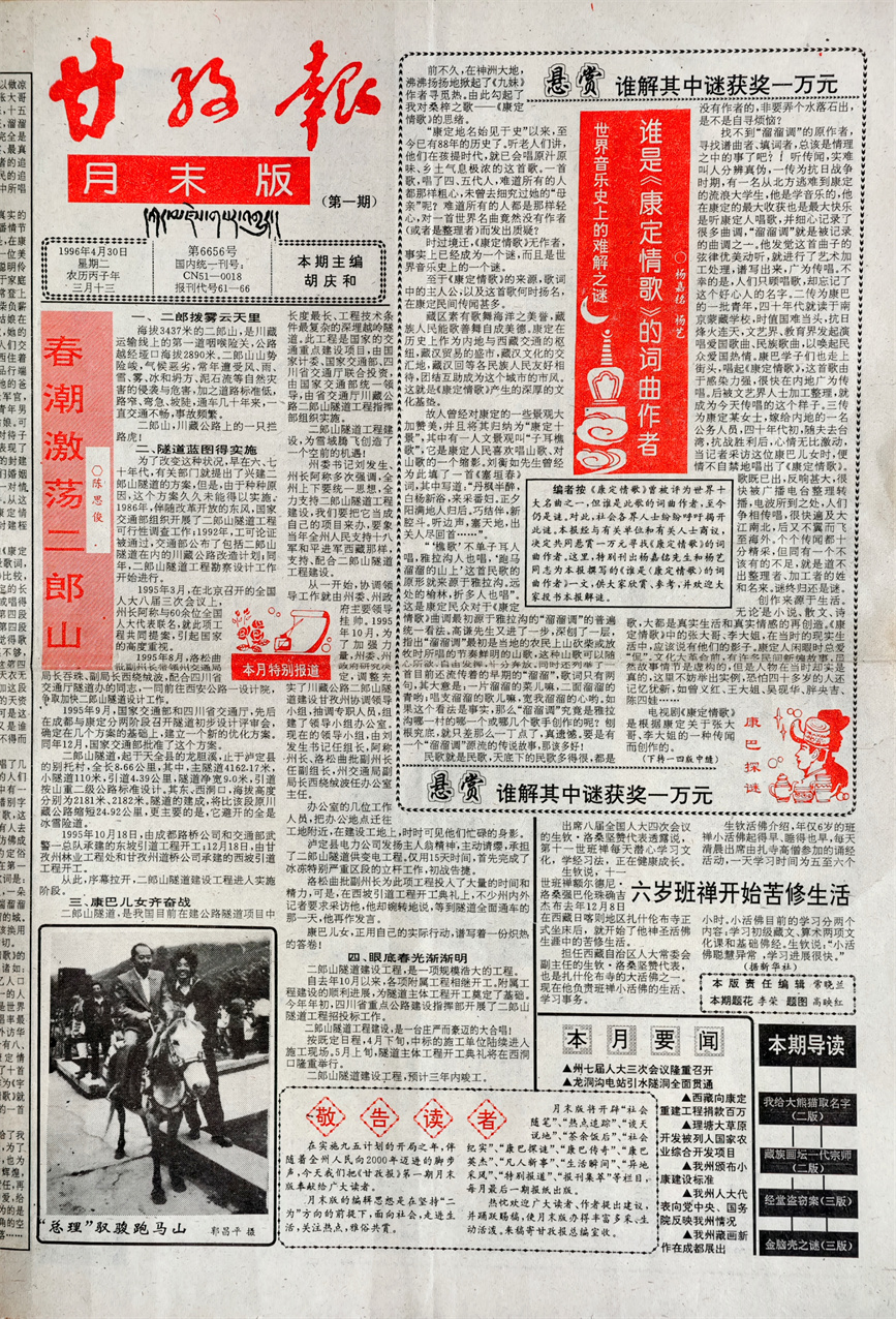 第一期“月末版”第一版除了楊嘉銘先生和他女兒楊藝的這篇文章,同時還刊載了陳思俊先生采寫的有關(guān)二郎山隧道建設(shè)的文章《春潮激蕩二郎山》,第二版刊載了七美多吉先生寫的《我給大熊貓取名字》;扎西次仁先生寫的《藏族畫壇一代宗師——安多強(qiáng)巴》;楊仕強(qiáng)先生寫的《余德康和十里魚香》,以及我寫的《歡天喜地下農(nóng)村》。第三版刊載了陳貴林先生寫的《經(jīng)堂盜竊案》;陳艾老先生寫的《金腦殼之謎》以及紫夫先生寫的《看熱鬧也深沉》。第四版刊載了尹凌寫的《俄羅斯之冬》。看看這些文章,光是標(biāo)題就讓人有一種欲睹為快的沖動。所以這張報紙一經(jīng)問世,便在州內(nèi)外引起了廣泛的關(guān)注,州內(nèi)更是一時洛陽紙貴,大家紛紛到郵局搶購,辦公室內(nèi)一報難尋。尤其是“萬元懸賞尋找《康定情歌》作者”一事在康定城內(nèi)的街頭巷尾引發(fā)熱議,想不到享譽(yù)世界的《康定情歌》,居然作者是誰都還不明白。幾天之后,在全國享有極大影響力的《羊城晚報》、《華西都市報》、《四川日報》等知名媒體均在重要版面對此給予了轉(zhuǎn)載。