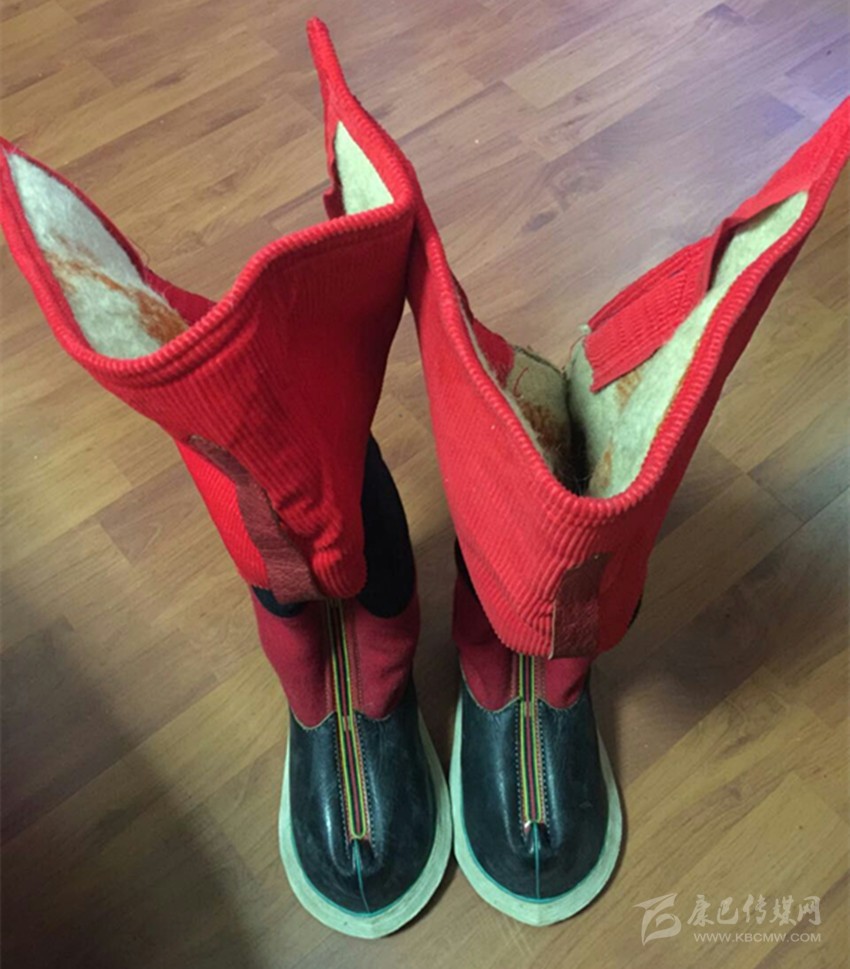 藏靴,是藏民不可缺少的用品,靴子的原料為牛皮,用較厚的牛皮作底,薄一點的作面,底和面的縫合則用牛羊皮條,鞋口前端還有帶毛的牛羊皮裝飾。從外觀上看類似舞臺上古裝戲里將相穿的靴子,靴子內(nèi)里有毛絨,既暖和又舒適,鞋腰還配有由氆氌等原料制成的各類樣式的線條、花紋。