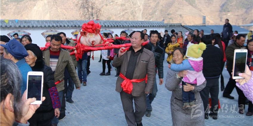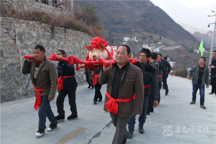 5個(gè)村民將年豬抬到秤上。360斤。村民為年豬準(zhǔn)備大紅花。準(zhǔn)備紙錢(qián)、香蠟。9點(diǎn)整,殺豬匠開(kāi)始了他的工作,在眾人齊心協(xié)力下,光溜溜的年豬被打整干凈?!氨S游覀兇鍋?lái)年風(fēng)調(diào)雨順、五谷豐登,村民平安健康?!贝逯欣险呔催^(guò)天地后,8個(gè)身強(qiáng)力壯的村民站在年豬旁,豎著拇指齊聲說(shuō),今年家家戶(hù)戶(hù)還要養(yǎng)大肥豬。抬著年豬,村里的中老年人簇?fù)碇咴谧钋懊?,唱著悅耳的民謠,大意是歌唱幸福生活的,迎著2018年的第一縷陽(yáng)光,村民們喜氣洋洋。到村里來(lái)的游客蜂擁拍照。