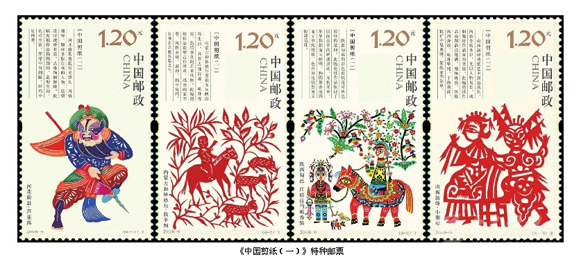 2018年1月24日,中國(guó)郵政發(fā)行《中國(guó)剪紙(第一組)》特種郵票,全套4枚。這是中國(guó)郵政繼1959年1月1日發(fā)行的《剪紙》特種郵票59年后重新發(fā)行的《中國(guó)剪紙》系列郵票。全系列郵票計(jì)劃發(fā)行4組,每組4枚。這次發(fā)行的第一組4枚郵票入選內(nèi)容分別是被列入第一批國(guó)家級(jí)非物質(zhì)文化遺產(chǎn)名錄的北方四處剪紙傳承人的作品:第一枚“河北蔚縣·蘆花蕩”,河北蔚縣剪紙歷史悠久,風(fēng)格獨(dú)特,題材多取自于人物,造型設(shè)計(jì)疏密有致,點(diǎn)染絢麗鮮艷。此幅作品作者王老賞(1890-1951),河北省蔚縣南張莊村人;第二枚“內(nèi)蒙和林格爾·牧羊圖”,內(nèi)蒙古和林格爾剪紙多反映游牧生活,具有古拙浪漫、質(zhì)樸奔放、熱情率真的藝術(shù)風(fēng)格。此幅作品作者張花女 (1903-2004),和林格爾縣董家營(yíng)鄉(xiāng)曹老八夭村人;第三枚“陜西旬邑·江娃拉馬梅香騎”,陜西旬邑的彩色剪紙具有民間美術(shù)的鮮活靈動(dòng),無(wú)拘無(wú)束,形象稚拙而又鮮明,構(gòu)圖緊密完滿而又單純明快,色彩對(duì)比強(qiáng)烈而又協(xié)調(diào)適度。此幅作品作者庫(kù)淑蘭(1920-2004),陜西咸陽(yáng)市旬邑縣張洪鎮(zhèn)赤道鄉(xiāng)富村人;第四枚“山西新絳·小別母”,山西新絳剪紙藝術(shù)源遠(yuǎn)流長(zhǎng),內(nèi)容豐富多彩,尤以人物見(jiàn)長(zhǎng),戲曲題材作品更為突出,構(gòu)圖簡(jiǎn)潔飽滿、精煉極致,粗獷中見(jiàn)典雅,簡(jiǎn)煉而不簡(jiǎn)單。此幅作品作者蘇蘭花(1906-1995),山西運(yùn)城市新絳縣澤掌鎮(zhèn)北蘇村人。
