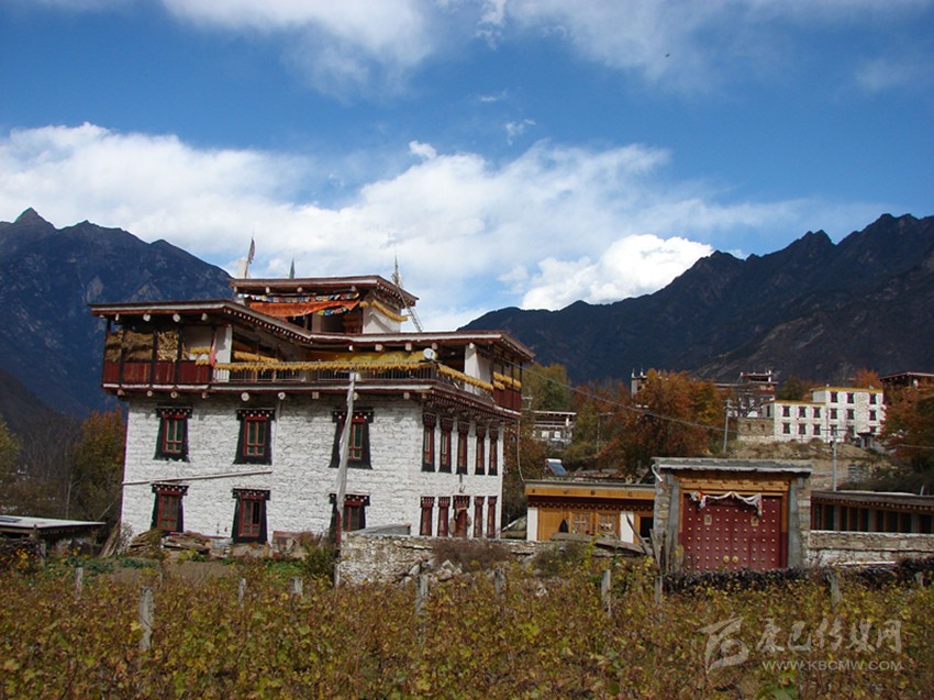 當(dāng)翻過一處斷崖,眼前豁然開朗。一大片平整的田地出現(xiàn)在我們的面前。田地里,一棟棟白色的藏房或鶴立雞群,或三五聚集,看似毫無規(guī)律,其實(shí)從整個(gè)房屋大門的朝向可以看出,在房基的選擇時(shí),對陽光的接納面、風(fēng)水等都作了充分的考慮。
