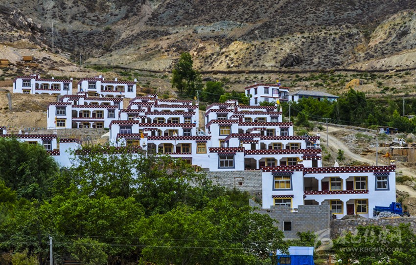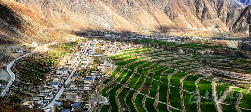 從得榮縣城出發(fā),途經日龍鄉(xiāng),汽車順著盤山公路開始往下行駛,到半山腰處,司機輕輕踩一腳剎車熄火,在此作短暫休息。這時,我打開車門俯瞰金沙江畔的因都壩,但見公路兩側一排排整齊的房屋像火柴盒一樣連綴在平坦壩子上,房屋下端,麥田梯次舒展,麥浪涌動,蔚為壯觀。