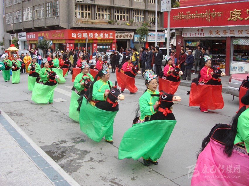 半個(gè)世紀(jì)風(fēng)靡康定城的“船燈”、“馬馬燈”、“鬧山鼓”、“扭秧歌”、“笑頭和尚戲柳翠”、“霸王鞭”……整個(gè)兒就像老陜過(guò)年時(shí)的“社戲”場(chǎng)面。大年初一、十五夜“出燈”游街,熱鬧氣氛把整個(gè)年節(jié)塞得滿(mǎn)滿(mǎn)的。記得我孩童時(shí)見(jiàn)過(guò)一次“出燈”游行,不是晚上而是在大白天(叫“出游”)。寺廟喇嘛吹奏佛樂(lè)走在前面,接著是“川北”人的川劇鑼鼓;再后面跟著的就是“馬馬燈”、劉老陜的“船燈”、鐵木社的“龍燈”、二輕局的“霸王鞭”、南門(mén)上的弦子隊(duì)、三居委的腰鼓隊(duì)、北三巷的“道孚鍋莊隊(duì)”……游行隊(duì)伍遇街口寬敞地方必圍圈演出?!叭死侠玻死侠?,人老先從頭上老,白的多來(lái)黑的少, 開(kāi)——船——羅!”“銀須飄灑”的艄公劉老陜用俏皮逗趣的陜腔告白開(kāi)場(chǎng)詞,在歡喜鑼鼓的伴奏中“劃”著旱船出了場(chǎng)。旱船闖“急流”、過(guò)“險(xiǎn)灘”,風(fēng)趣又逼真;如果哪家的姑娘打扮成古裝戲里的嬌美仕女坐上旱船游了街,那她立馬就成了康定城人皆贊譽(yù)的“美女”。接著就是“馬馬燈”,幾十個(gè)“騎馬橫槍”的古裝將士馳騁上場(chǎng),排兵布陣,穿梭并行,“馬”鈴聲鼓樂(lè)聲交織一起……鬧翻了康定城的“三山二水”。