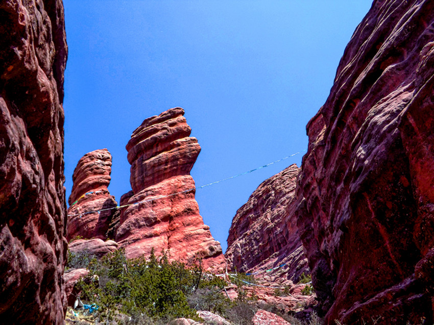 環(huán)顧四周,滿目怪石如林、變化萬千的紅山地貌群,巨大形狀的,如城堡或紅色的塔樓,或雄偉壯觀拔地而起石墻,陡峭直立的錐形物,小型的栩栩如生似鳥獸或人,有的像觀音、佛塔、吉祥海螺、金剛杵,有不少像藏族民間常用泥捏成的祭祀、祈禱用的“察察”,奇石異峰精巧豐富,星羅棋布。
