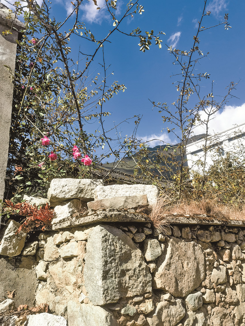 在小飯館里簡(jiǎn)單吃了一頓午餐,可惜沒(méi)有嵐安豆花,臘肉倒是如大家說(shuō)的那樣香。吃完飯?jiān)诖遄永锫o(wú)目的的轉(zhuǎn)悠,石頭砌的矮墻將每家每戶(hù)的房屋圍成院子,墻頭上的草已經(jīng)泛黃枯萎,偶爾有幾枝玫紅色的月季從墻頭伸出來(lái),給石墻點(diǎn)綴了一些色彩和生機(jī)。石墻與石墻之間,是串聯(lián)起每一戶(hù)人家的村間小道,經(jīng)過(guò)幾戶(hù)農(nóng)家,腳下硬化的路面斷了,往前延伸的是窄小的泥路,路兩旁有綠油油的菜地,有收割完的玉米地,有一排排的蘋(píng)果樹(shù)……往更遠(yuǎn)的地方看去,田地盡頭的山坡上是紅軍紀(jì)念碑,原來(lái)這里可以通往紀(jì)念碑,不過(guò)目測(cè)距離有點(diǎn)遠(yuǎn),收住腳步往回走,沿著村道朝另外一個(gè)方向走走看。前面是散落在小山坡上的幾戶(hù)人家,比起之前被石墻圍起看不見(jiàn)樣貌的農(nóng)家,山坡上的這些房子錯(cuò)落有致,清楚的看得見(jiàn)院子的全貌,房屋大多是一層的由石墻瓦頂構(gòu)筑的,每一戶(hù)人家都飄揚(yáng)著鮮艷的紅旗。