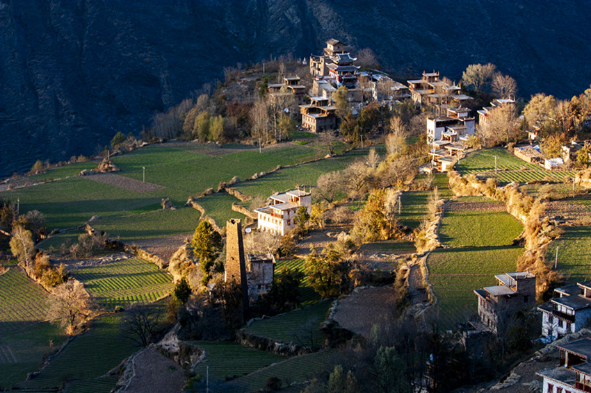丹巴,無論在深山峽溝,還是在田間林園,藏房路口隨處可見高大的古碉以及殘垣斷墻的碉址遺跡,這一切蘊含著多么大的勞動量。殘酷的年代,先民們赤腳背石,手抓繩索,一石一泥,一檁一椽,日復(fù)一日,年復(fù)一年,一點點背上去,一寸寸砌起來。這樣可敬的古碉,它的每一個角、每一塊石頭、每一鏟泥巴,都是先民們用汗水所鑄,同時也寫下了藏民建筑史上光輝的歷史。