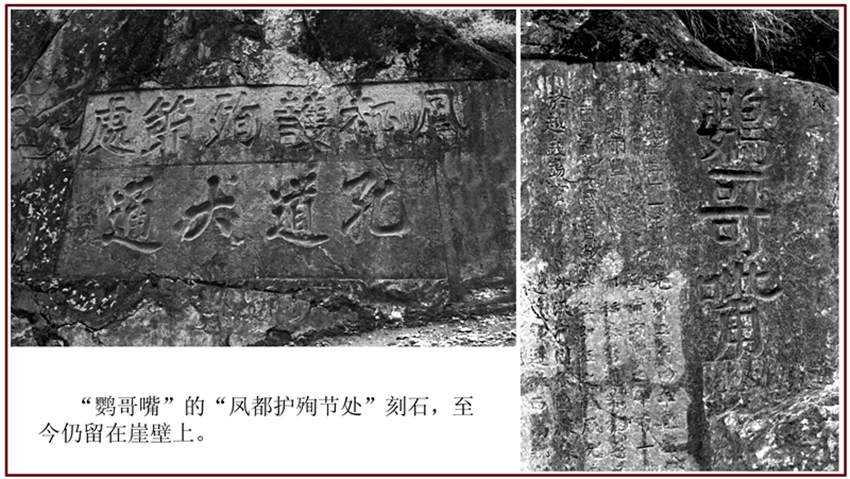 緊靠“鸚哥嘴”的,便是兩行從右至左、一上一下的橫書巨刻:“鳳都護殉節(jié)處”和“孔道大通”。它分明詔告世人,當(dāng)年那埸把康巴藏區(qū)鬧得個地覆天翻的大戲,便是從這里揭幕的。