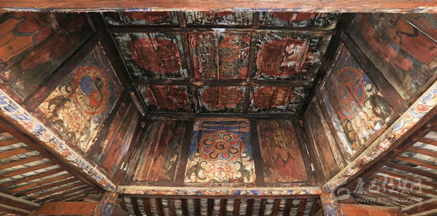 在介紹的過(guò)程中,我發(fā)現(xiàn)這座小寺不簡(jiǎn)單,很想到正殿看看。到了殿里,我發(fā)現(xiàn)殿內(nèi)佛像具備,壁畫、板畫以及唐卡數(shù)量眾多,皆是工藝精湛。廟宇四檐有青銅制風(fēng)鈴4個(gè),但是一樓的壁畫看著像是維修過(guò)。