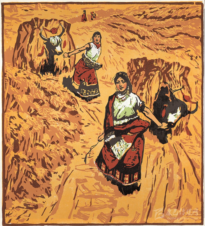 《初踏黃金路》油印套色木刻1963李煥民。