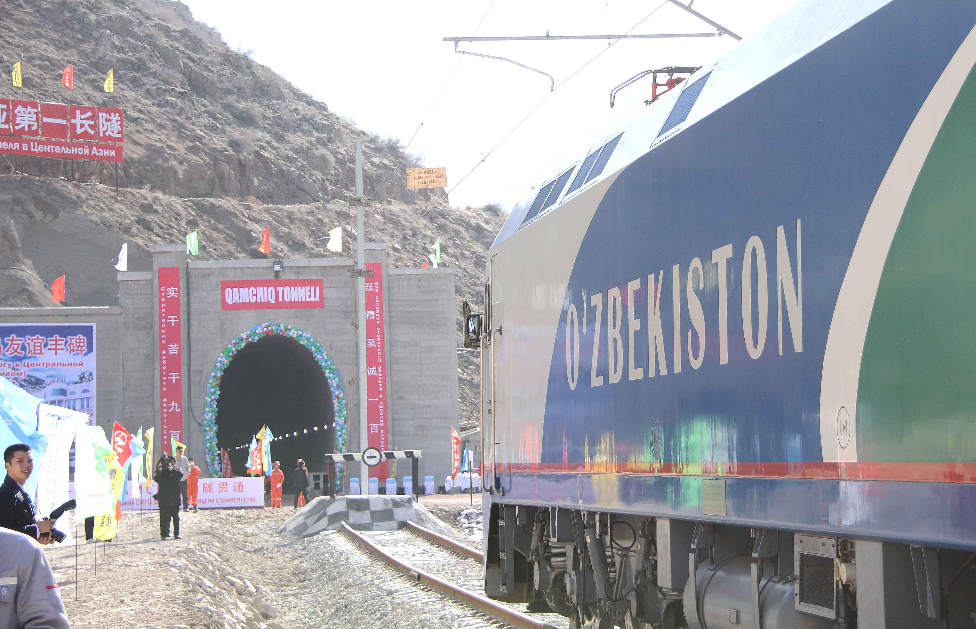△ 2016年2月27日,一列專列停在烏茲別克斯坦安格連至琶布鐵路甘姆奇克隧道進(jìn)口。甘姆奇克隧道是中吉烏鐵路的重要一環(huán),對促進(jìn)烏茲別克斯坦經(jīng)濟(jì)社會(huì)發(fā)展和共建“一帶一路”倡議的實(shí)施具有重大意義。