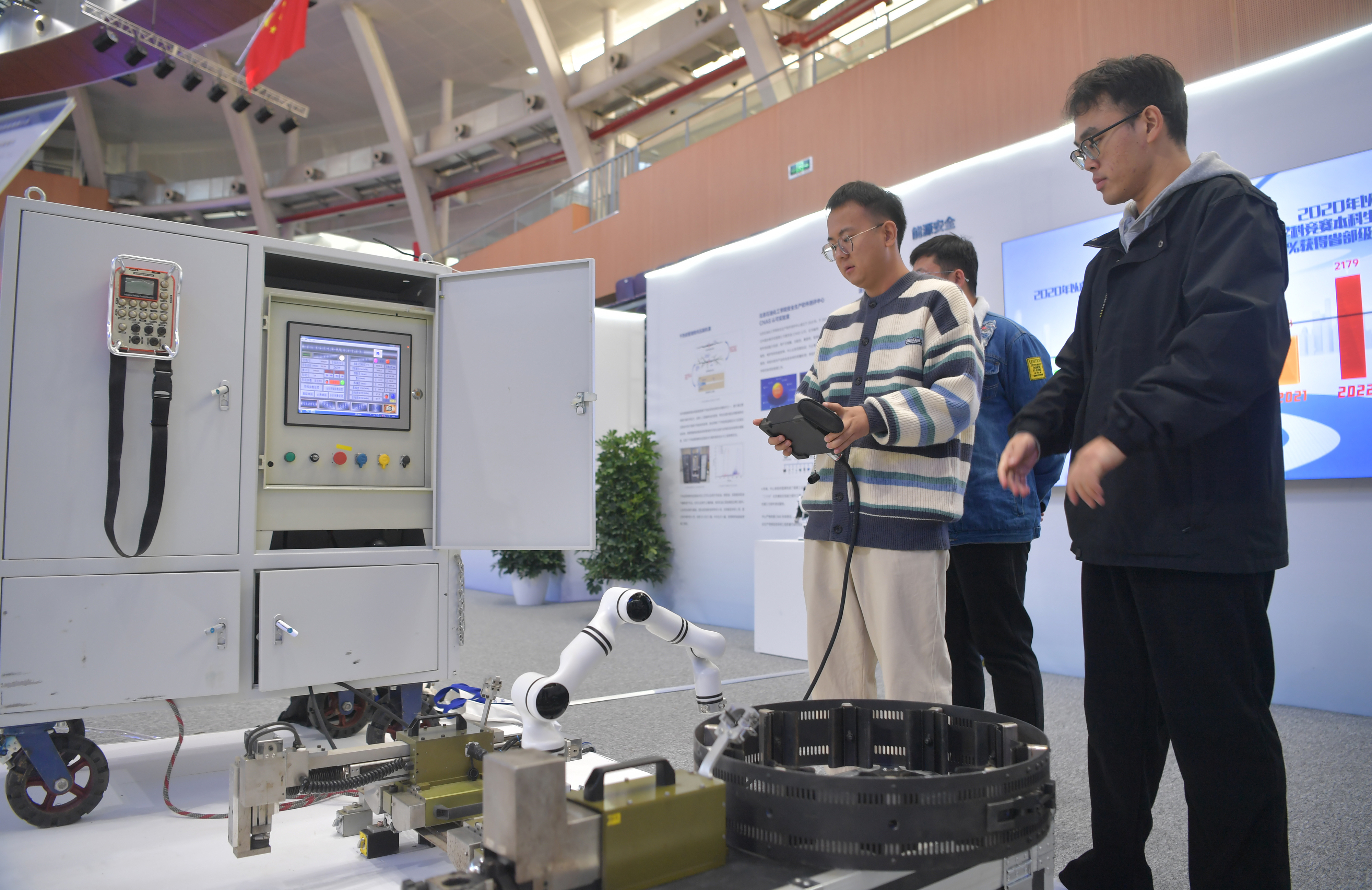 2023年,京南地區(qū)高??萍汲晒平闀?huì)在北京建筑大學(xué)大興校區(qū)舉行。圖為高校師生在展示管道全位置焊接機(jī)器人系統(tǒng)成果。