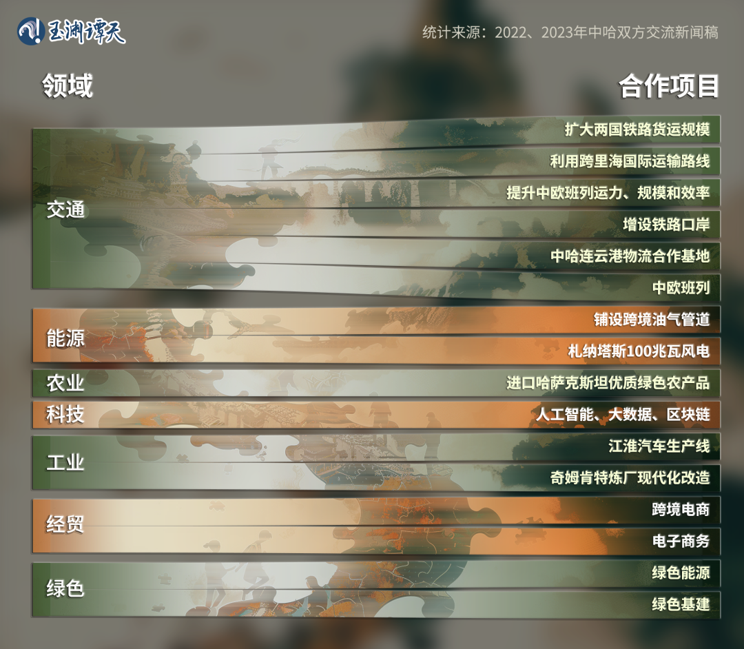 這兩年間,中哈提到的合作項(xiàng)目,涉及交通、能源、工業(yè)、農(nóng)業(yè)、經(jīng)貿(mào)、科技等多個領(lǐng)域,其中出現(xiàn)頻次最多的,是交通——從“中歐班列”、“增設(shè)鐵路口岸”,再到“中哈連云港物流合作基地”。