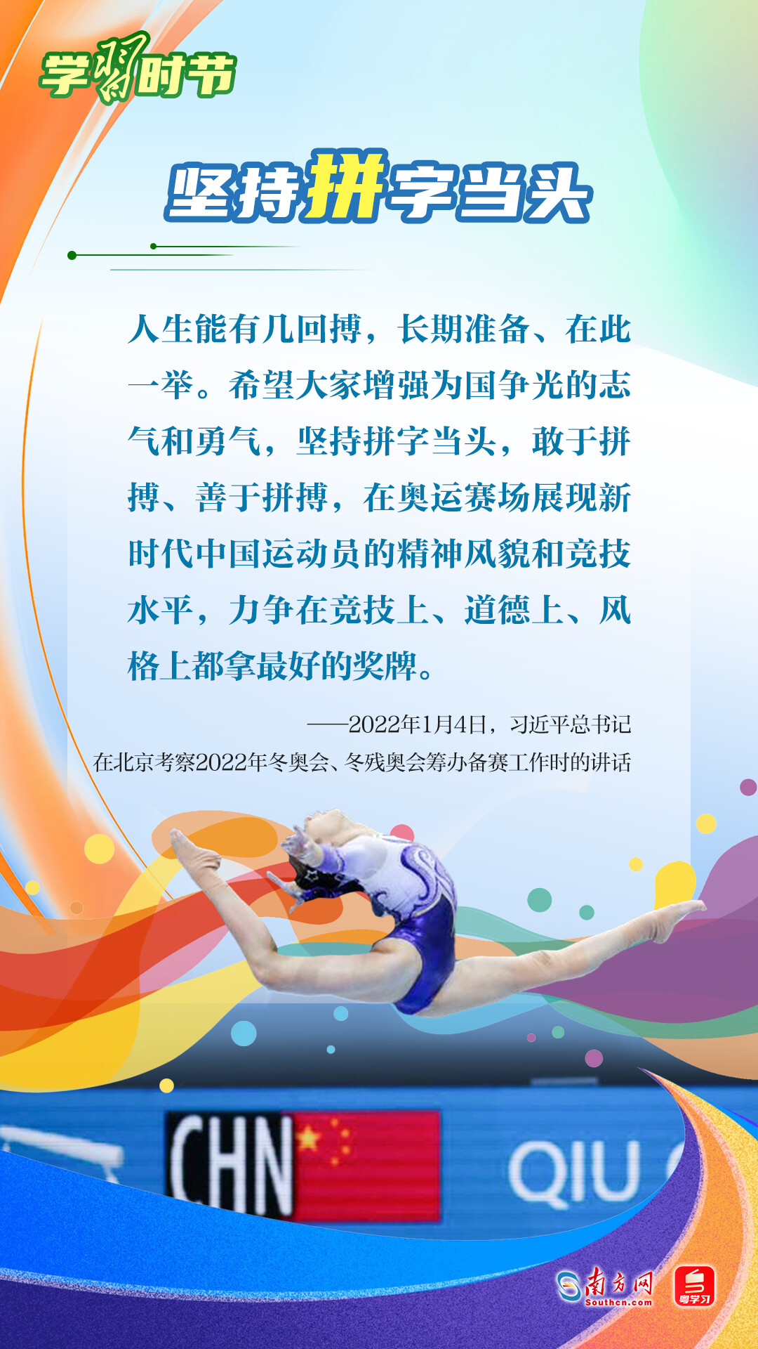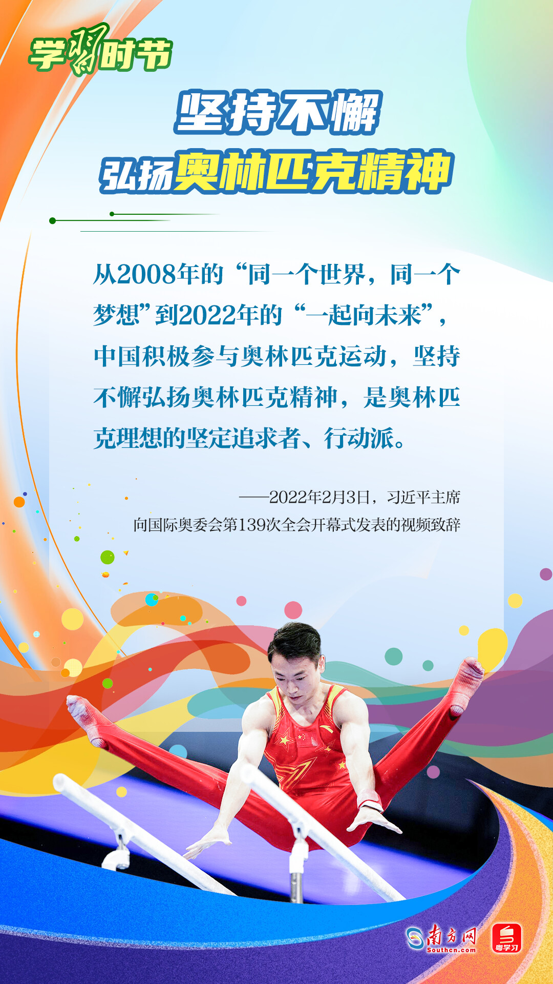 “我們不以勝負(fù)論英雄,同時(shí)英雄就要敢于爭(zhēng)先、敢于爭(zhēng)第一。”習(xí)近平總書(shū)記曾在不同場(chǎng)合論述奧林匹克精神,深刻闡明了勝與負(fù)、成與敗的辯證關(guān)系,對(duì)奧林匹克“更快、更高、更強(qiáng)——更團(tuán)結(jié)”的格言進(jìn)行詮釋。讓我們一同學(xué)習(xí)習(xí)近平總書(shū)記對(duì)奧林匹克精神的重要論述,心懷夢(mèng)想、奮勇拼搏,攜手走向美好明天。