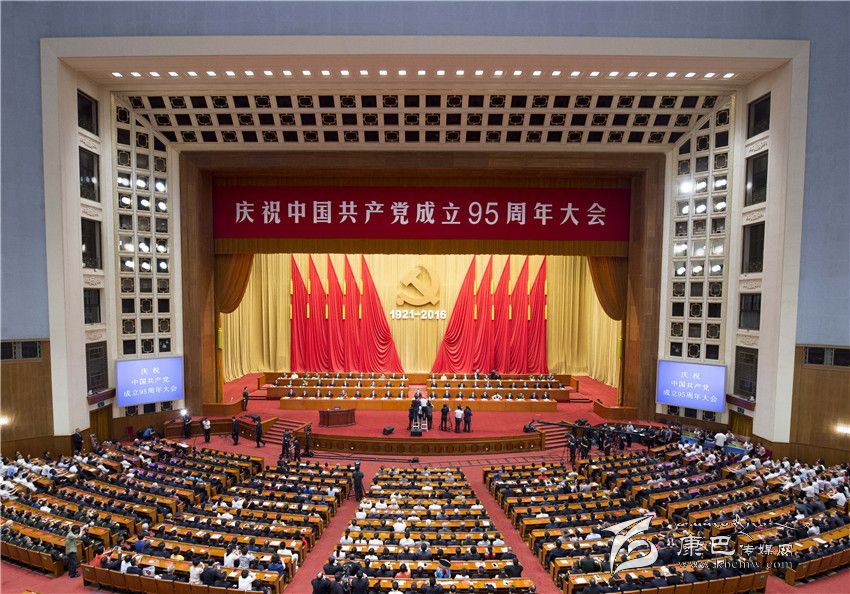 人民大會堂雄偉莊嚴,萬人大禮堂燈火輝煌。主席臺上方懸掛著“慶祝中國共產(chǎn)黨成立95周年大會”會標。帷幕正中,由鐮刀和錘頭組成的中國共產(chǎn)黨黨徽在十面紅旗映襯下熠熠生輝,“1921-2016”字樣格外醒目。大禮堂二層眺臺懸掛橫幅:緊密團結(jié)在以習近平同志為總書記的黨中央周圍,銳意進取、開拓創(chuàng)新,全面推進黨的建設(shè)新的偉大工程,為實現(xiàn)“兩個一百年”奮斗目標、實現(xiàn)中華民族偉大復興的中國夢而努力奮斗!