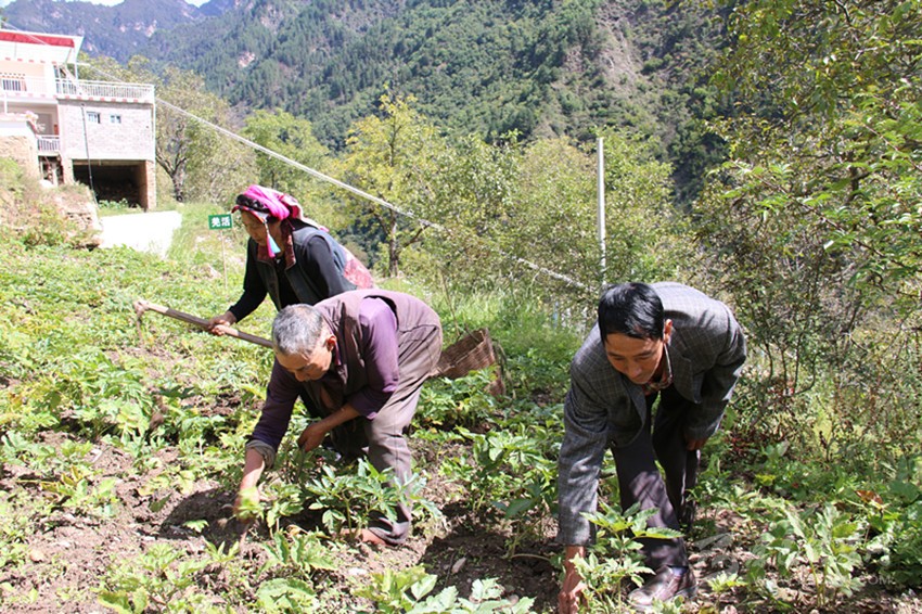 丹巴縣半扇門鄉(xiāng)大邑村駐村第一書記與村民共同勞作。