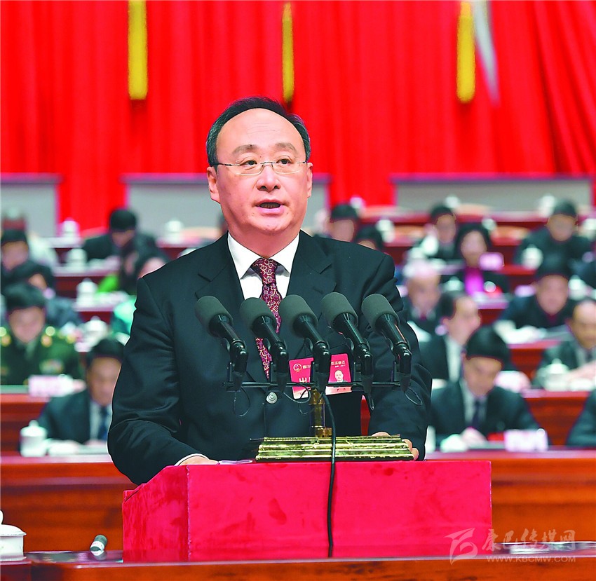 省長尹力代表省人民政府作工作報(bào)告。省政協(xié)主席柯尊平、西部戰(zhàn)區(qū)空軍司令員戰(zhàn)厚順出席大會(huì)并在主席臺(tái)就座。