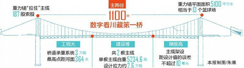 從地面走上188米高的塔臺,經(jīng)過1100米的主橋,再從塔臺間往下來到隧道錨,全程1個(gè)多小時(shí)。橋中最低處,距離河面也有269米。站在貓道往下俯視,大渡河如一塊碧玉,國道318線上的汽車小如煙盒。