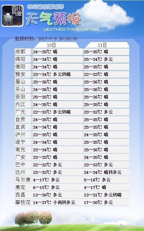 11日晚上到12日白天:盆地各市多云,廣元、巴中、雅安3市及綿陽(yáng)、德陽(yáng)、成都、眉山、樂(lè)山5市西部有陣雨或雷雨;川西高原和攀西地區(qū)晴轉(zhuǎn)多云,大部分地方有陣雨或雷雨。