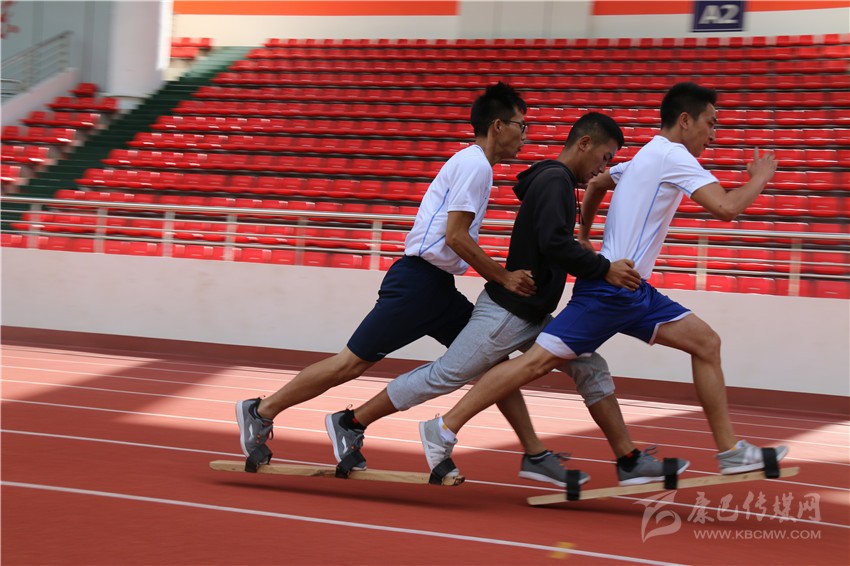 “啪,啪,啪……”,在高腳競速訓練場地的對面,板拍打地面的聲音有節(jié)奏地在賽道上回蕩著。記者看到4組板鞋競速隊正在有序訓練,每隊有三名運動員,他們都把腳套在一個木板鞋上,后面的兩個運動員把手放在前一個運動員的腰上,三個人齊心協(xié)力,喊著有節(jié)奏的口號,彼此邁著統(tǒng)一的步伐為了共同的目標而前進。每一組的隊員都是齊心協(xié)力,好像他們已然融為一體,步伐的頻率和擺臂的頻率都是一致的,絲毫沒有違和感。