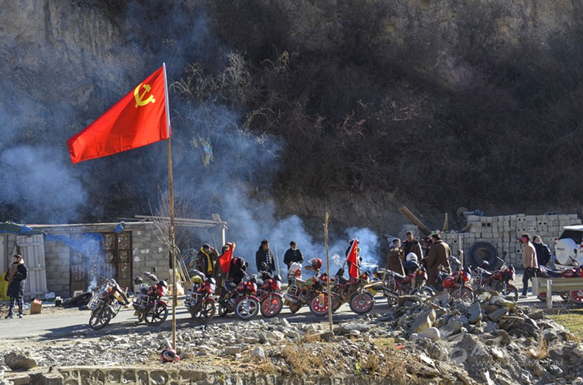 白玉縣山巖鄉(xiāng)摩托車隊以黨旗為引領,及時支援受災害威脅的村民。 本網(wǎng)資料圖