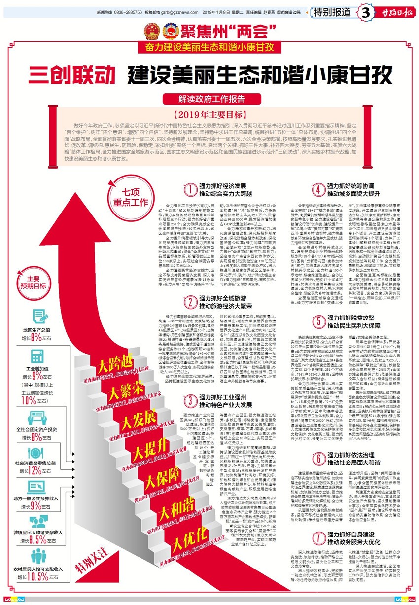 按照高質(zhì)量發(fā)展要求,扎實(shí)推進(jìn)穩(wěn)增長(zhǎng)、促改革、調(diào)結(jié)構(gòu)、惠民生、防風(fēng)險(xiǎn)、保穩(wěn)定,緊扣州委“圍繞一個(gè)目標(biāo)、突出兩個(gè)關(guān)鍵、抓好三件大事、補(bǔ)齊四大短板、夯實(shí)五大基礎(chǔ)、實(shí)施六大戰(zhàn)略”總體工作格局,全力推進(jìn)國(guó)家全域旅游示范區(qū)、國(guó)家生態(tài)文明建設(shè)示范區(qū)和全國(guó)民族團(tuán)結(jié)進(jìn)步示范州“三創(chuàng)聯(lián)動(dòng)”,深入實(shí)施鄉(xiāng)村振興戰(zhàn)略,加快建設(shè)美麗生態(tài)和諧小康甘孜……
