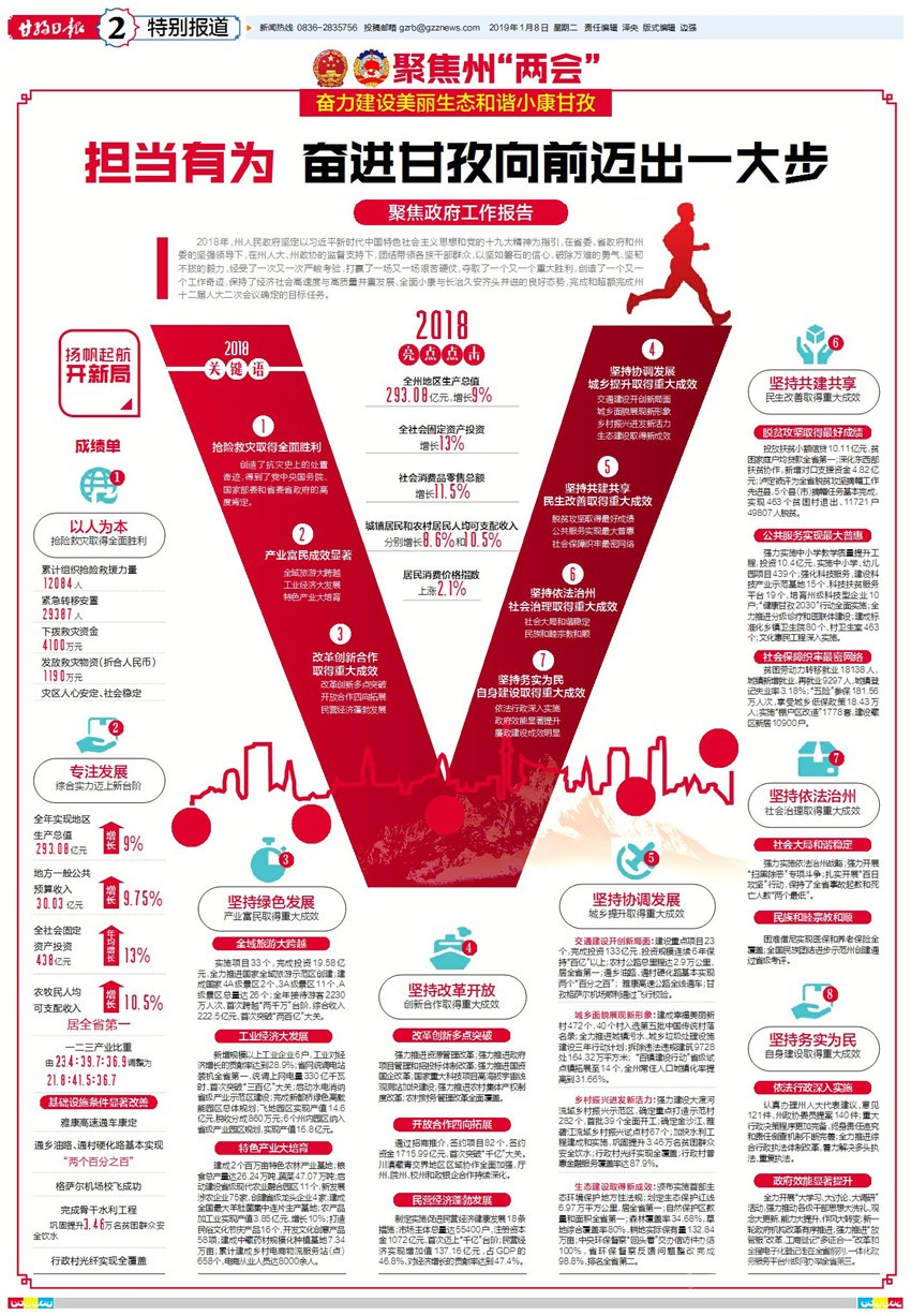 2018年全州實(shí)現(xiàn)地區(qū)生產(chǎn)總值293.08億元,增長(zhǎng)9%,超目標(biāo)任務(wù)1.5個(gè)百分點(diǎn);地方一般公共預(yù)算收入30.03億元,增長(zhǎng)9.75%,超目標(biāo)任務(wù)1.75個(gè)百分點(diǎn)”“城鎮(zhèn)居民人均可支配收入32022元,增長(zhǎng)8.6%,超目標(biāo)任務(wù)0.1個(gè)百分點(diǎn);農(nóng)村居民人均可支配收入11540元,增長(zhǎng)10.5%,超目標(biāo)任務(wù)0.5個(gè)百分點(diǎn)……