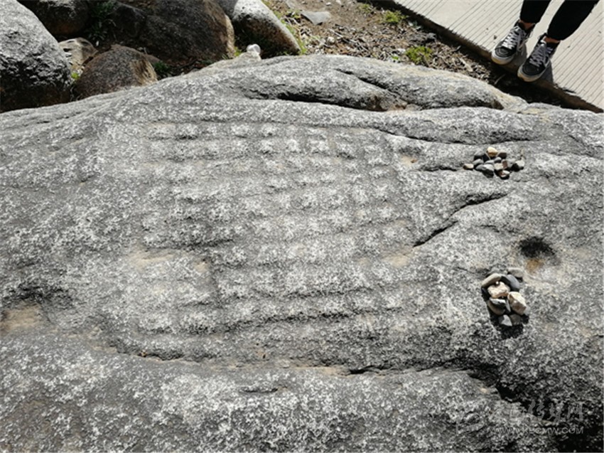 此次發(fā)現(xiàn)的唐蕃時期藏棋石刻棋盤距離甘孜縣城約30公里,沿國道317線甘孜縣向德格縣方向卡公鄉(xiāng)境內。石刻位于公路約500米處,在1處約300余平方米、深1.6米左右的露天溫泉傍。棋盤刻在一塊重約2頓,巖面近1.5平方米花崗石表面中央,巖面整齊的刻著2.5厘米的格子,縱橫各10道線,在棋盤的左右對角兩邊,還刻有裝棋子的圓形石孔,類似于現(xiàn)今的圍棋盤。