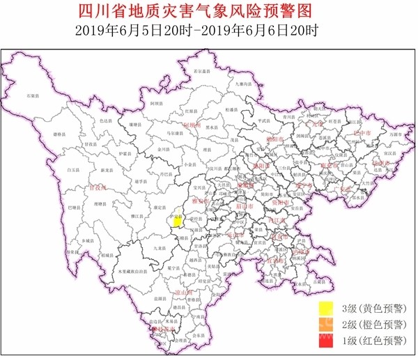 四川在線消息(記者 寇敏芳)6月5日,省自然資源廳發(fā)布全省地質(zhì)災(zāi)害氣象風(fēng)險預(yù)警。結(jié)合四川省氣象臺天氣預(yù)報情況,6月5日20時~6月6日20時,全省地質(zhì)災(zāi)害氣象風(fēng)險預(yù)警等級為3級(黃色預(yù)警,注意級),具體結(jié)果如下: