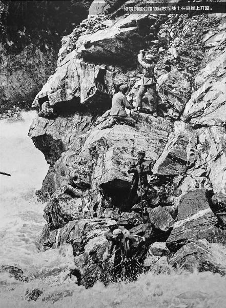 走過(guò)浮雕不到20米,一面組圖形成的墻面吸引了大量觀眾。一幅解放軍戰(zhàn)士在懸崖上開(kāi)路的照片給人帶來(lái)巨大的視覺(jué)沖擊,這是當(dāng)年川藏公路修筑時(shí)的一幕,文字注解寫(xiě)著:1954年12月,貫通“世界屋脊”的康藏公路、青藏公路全線通車,結(jié)束了西藏沒(méi)有公路的歷史……1955年10月,康藏公路改名為川藏公路。