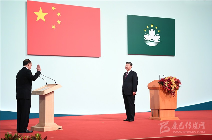 慶祝澳門回歸祖國20周年大會暨澳門特別行政區(qū)第五屆政府就職典禮20日上午在澳門東亞運動會體育館隆重舉行。中共中央總書記、國家主席、中央軍委主席習近平出席并發(fā)表重要講話。他指出,澳門回歸祖國20年來,澳門特別行政區(qū)政府和社會各界人士同心協(xié)力,開創(chuàng)了澳門歷史上最好的發(fā)展局面,譜寫了具有澳門特色的“一國兩制”成功實踐的華彩篇章。他希望澳門特別行政區(qū)新一屆政府和社會各界人士站高望遠、居安思危,守正創(chuàng)新、務(wù)實有為,在已有成就的基礎(chǔ)上推動澳門特別行政區(qū)各項建設(shè)事業(yè)躍上新臺階。